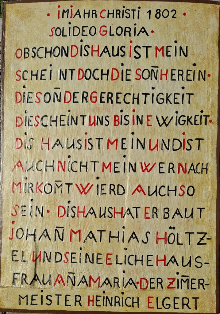 Das zur Veranstaltung veröffentlichte Bild zeigt das ehemalige Haus vom Kramer-Bäcker in der Rheinstraße 31. Beim Rundgang wurde von einer Tafel berichtet, die früher an dem Haus angebracht war. Bitteschön – hier ist die Tafel, die in der Mitte der unteren Reihe der Gefache im 1. Stock schwach zu erkennen ist.